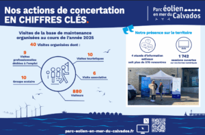 En 2025, le Parc éolien en mer du Calvados a poursuivi son engagement auprès des différentes parties prenantes locales à travers de nombreuses actions. Stands d’information sur le territoire, visites de la base de maintenance, tables numériques mises à disposition,…