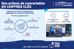 En 2025, le Parc éolien en mer du Calvados a poursuivi son engagement auprès des différentes parties prenantes locales à travers de nombreuses actions. Stands d’information sur le territoire, visites de la base de maintenance, tables numériques mises à disposition,…